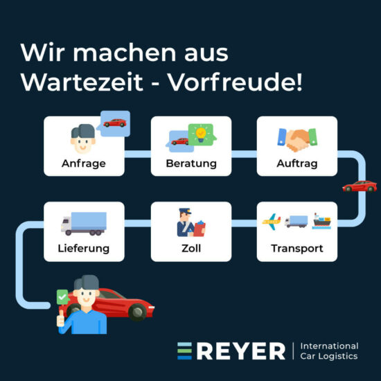 Wir von REYER – International Car Logistics übernehmen für Sie die komplette Logistik, von der Abholung bis zur Lieferung an Ihre Wunschadresse, inklusive aller Zollformalitäten.