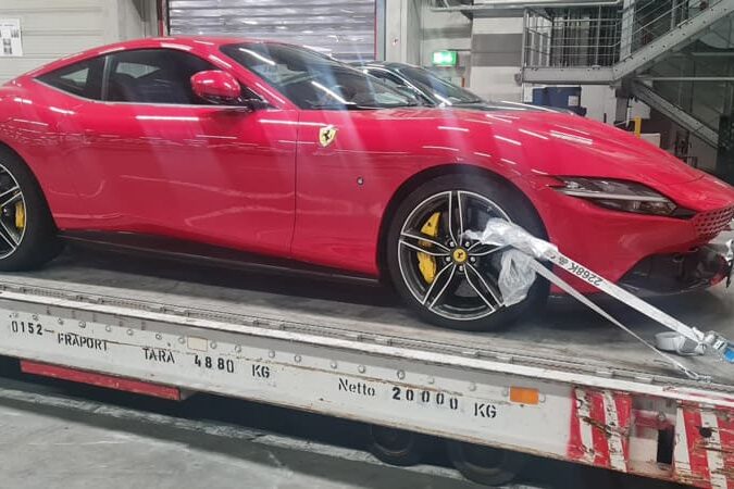 Exporte Erstklassige Fahrzeuglieferung – Ein Ferrari Roma nach Dubai 23. November 2023 Luftfracht. Nach Dubai.